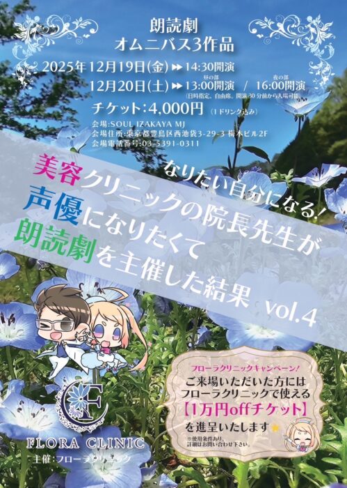 さくちゃん先生が朗読劇を開催します 2025年11月27日 さくちゃん先生が朗読劇を開催します。 『美容クリニックの院長先生が声優になりたくて朗読劇を主催した結果 vol.4』 詳細はこちらをクリック ◆会場 SOUL IZAKAYA MJ 東京都豊島区西池袋3-29-3 梅本ビル2F ◆開演日程 12月19日(金) ▶ 14:30 12月20日(土) ▶ 13:00/16:00 ◆チケット 4,000円(1ドリンク付き) ご来場の方全員に【フローラクリニックで使える1万円OFFチケット】プレゼント 声の魅力と朗読の世界をゆったり楽しめる公演です。 ◆ご予約方法: 公式LINEにて承ります。 公式ラインはこちらをクリック 「ご希望の日程・時間・氏名」を記載の上、ご連絡ください。 皆さまのご予約をお待ちしております。 美容外科・美容皮膚科フローラクリニック池袋院がキレイレポに掲載されました Previous Post 無料カウンセリングご予約・お問合せ 診療時間:10:00~19:00(不定休) 03-6384-7748 テレビ取材・ロケ・撮影・場所提供について reception@flora-clinic.jp お電話またはlineよりご予約を受け付けております。カウンセリングは無料です。 フォームからもお問合せ可能です。 コスプレイヤーの方もメール、SNS等からお気軽にご連絡ください。